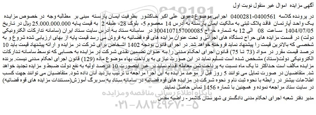 در پرونده کلاسه 0400281-0400561 اجرایی موضوع دعوی علی اکبر خاکشور بطرفیت ایمان پارسته مبنی بر مطالبه وجه در خصوص مزایده یک واحد آپارتمان فاقد پلاک ثبتی به مالکیت ایمان پارسته به آدرس 14 معصوم 5- بلوک 28- طبقه 2 به قیمت پایه 25.000.000.000 ریال در تاریخ 1404/07/05 ساعت 08 الی 12 به شماره حراج 3004107157000085 در سامانه ستاد به آدرس سایت ستاد ایران (سامانه تدارکات الکترونیکی دولت) در قسمت مزایده های حراج دستگاه های اجرائی و تحت عنوان مزایده های قوه قضائیه به فروش می رسد قیمت پایه از بهای ارزیابی شده شروع و به شخصی که بالاترین قیمت را پیشنهاد نماید فروخته خواهد شد. در اجرای قانون بودجه 1402 اشخاص برای شرکت در مزایده و ارائه پیشنهاد قیمت باید 10 درصد قیمت مقرر در مواد (73 تا 75) قانون اجرای احکام مدنی را به عنوان تضمین نقدی شرکت در مزایده به حسابی که توسط سامانه تدارکات الکترونیکی دولت(ستاد) مشخص شده است تسلیم نماید در این صورت نیازی به پرداخت بهاء موضوع ماده (129) قانون اجرای احکام مدنی نیست. برنده مزایده مکلف است حداکثر تا یک ماه نسبت به پرداخت ثمن معامله اقدام نماید در غیر اینصورت 10 درصد اولیه به نفع دولت ضبط و مزایده تجدید خواهد شد. متقاضیان در صورت تمایل می توانند 5 روز قبل از موعد مزایده به این اجرا مراجعه تا ترتیب بازدید آنان داده شود. متقاضیان می توانند جهت کسب اطلاعات بیشتر در رابطه با نحوه ثبت نام و نحوه شرکت در مزایده های قوه قضائیه در سامانه ستاد به سربرگ آموزش(مستندات مزایده های قوه قضائیه) در سایت ستاد مراجعه نموده و همچنین با شماره 1456 تماس حاصل نمایند.