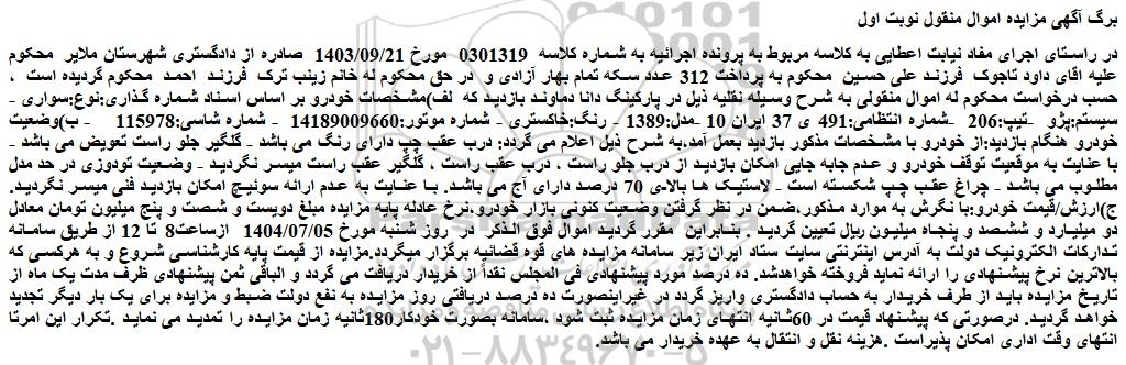 در راستای اجرای مفاد نیابت اعطایی به کلاسه مربوط به پرونده اجرائیه به شماره کلاسه 0301319 مورخ 1403/09/21 صادره از دادگستری شهرستان ملایر محکوم علیه اقای داود تاجوک فرزند علی حسین محکوم به پرداخت 312 عدد سکه تمام بهار آزادی و در حق محکوم له خانم زینب ترک فرزند احمد محکوم گردیده است ، حسب درخواست محکوم له اموال منقولی به شرح وسیله نقلیه ذیل در پارکینگ دانا دماوند بازدید که لف)مشخصات خودرو بر اساس اسناد شماره گذاری:نوع:سواری - سیستم:پژو -تیپ:206 -شماره انتظامی:491 ی 37 ایران 10 -مدل:1389 - رنگ:خاکستری - شماره موتور:14189009660 - شماره شاسی:115978 - ب)وضعیت خودرو هنگام بازدید:از خودرو با مشخصات مذکور بازدید بعمل آمد،به شرح ذیل اعلام می گردد: درب عقب چپ دارای رنگ می باشد - گلگیر جلو راست تعویض می باشد - با عنایت به موقعیت توقف خودرو و عدم جابه جایی امکان بازدید از درب جلو راست ، درب عقب راست ، گلگیر عقب راست میسر نگردید - وضعیت تودوزی در حد مدل مطلوب می باشد - چراغ عقب چپ شکسته است - لاستیک ها بالای 70 درصد دارای آج می باشد. با عنایت به عدم ارائه سوئیچ امکان بازدید فنی میسر نگردید. ج)ارزش/قیمت خودرو:با نگرش به موارد مذکور،ضمن در نظر گرفتن وضعیت کنونی بازار خودرو،نرخ عادله پایه مزایده مبلغ دویست و شصت و پنج میلیون تومان معادل دو میلیارد و ششصد و پنجاه میلیون ریال تعیین گردید . بنابراین مقرر گردید اموال فوق الذکر در روز شنبه مورخ 1404/07/05 ازساعت8 تا 12 از طریق سامانه تدارکات الکترونیک دولت به آدرس اینترنتی سایت ستاد ایران زیر سامانه مزایده های قوه قضائیه برگزار میگردد.مزایده از قیمت پایه کارشناسی شروع و به هرکسی که بالاترین نرخ پیشنهادی را ارائه نماید فروخته خواهدشد. ده درصد مورد پیشنهادی فی المجلس نقداً از خریدار دریافت می گردد و الباقی ثمن پیشنهادی ظرف مدت یک ماه از تاریخ مزایده باید از طرف خریدار به حساب دادگستری واریز گردد در غیراینصورت ده درصد دریافتی روز مزایده به نفع دولت ضبط و مزایده برای یک بار دیگر تجدید خواهد گردید. درصورتی که پیشنهاد قیمت در 60ثانیه انتهای زمان مزایده ثبت شود ،سامانه بصورت خودکار180ثانیه زمان مزایده را تمدید می نماید .تکرار این امرتا انتهای وقت اداری امکان پذیراست .هزینه نقل و انتقال به عهده خریدار می باشد.