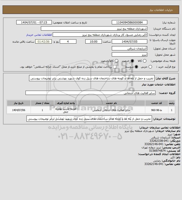 شرح کلی نیاز: تخریب و حمل از پله ها و کوچه های ساختمان های سیل زده کوی شهید بهشتی برابر توضیحات پیوستی