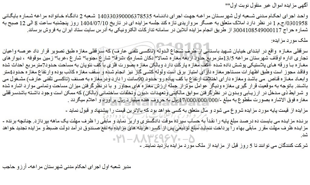 واحد اجرای احکام مدنی شعبه اول شهرستان مراغه جهت اجرای دادنامه 140330390006378535 شعبه 2 دادگاه خانواده مراغه شماره بایگانی 0301958/ج.م 1 در نظر دارد املاک متعلق به عسگر مرواریدی تازه کند جلسه مزایده ای در تاریخ 1404/07/10 روز پنجشنبه ساعت 8 الی 12 صبح به شماره حراج 3004108549000117 از طریق انجام مزایده آنلاین در سامانه تدارکات الکترونیکی به آدرس سایت ستاد ایران به فروش برساند.