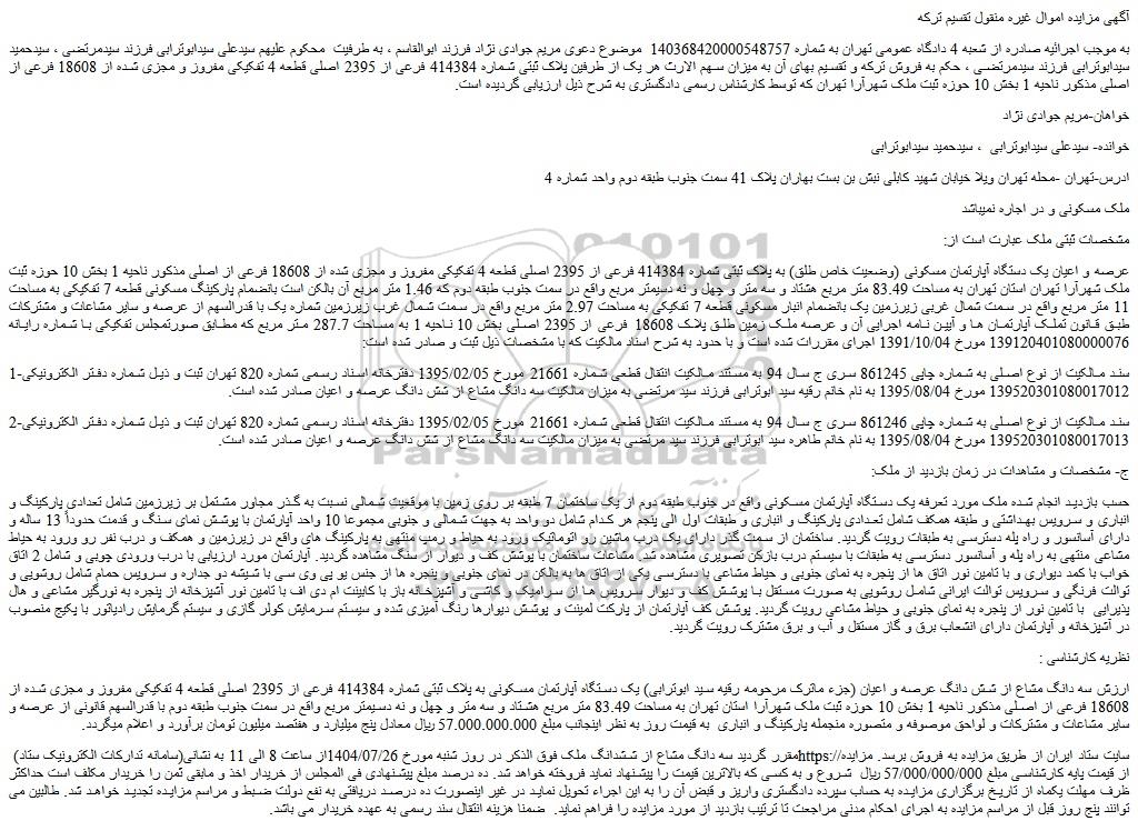 به موجب اجرائیه صادره از شعبه 4 دادگاه عمومی تهران به شماره 140368420000548757  موضوع دعوی مریم جوادی نژاد فرزند ابوالقاسم ، به طرفیت  محکوم علیهم سیدعلی سیدابوترابی فرزند سیدمرتضی ، سیدحمید سیدابوترابی فرزند سیدمرتضی ، حکم به فروش ترکه و تقسیم بهای آن به میزان سهم الارث هر یک از طرفین پلاک ثبتی شماره 414384 فرعی از 2395 اصلی قطعه 4 تفکیکی مفروز و مجزی شده از 18608 فرعی از اصلی مذکور ناحیه 1 بخش 10 حوزه ثبت ملک شهرآرا تهران که توسط کارشناس رسمی دادگستری به شرح ذیل ارزیابی گردیده است.