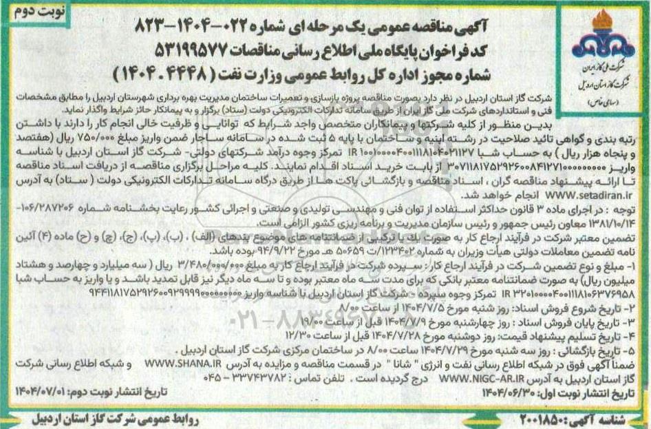 آگهی مناقصه عمومی یک مرحله ای با ارزیابی کیفی شماره 022-1404-823 ؟