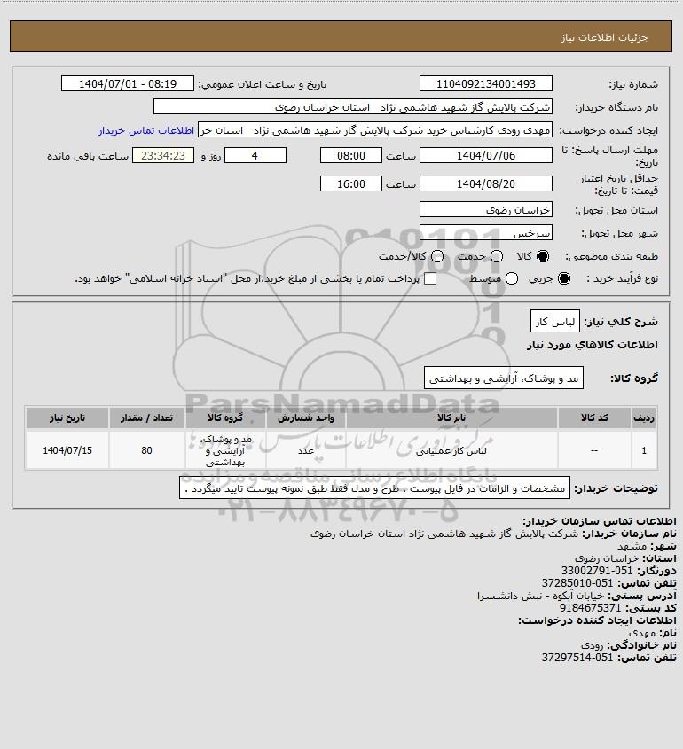 | 1 | -- | لباس کار عملیاتی | عدد | مد و پوشاک، آرایشی و بهداشتی | 80 | 1404/07/15 |