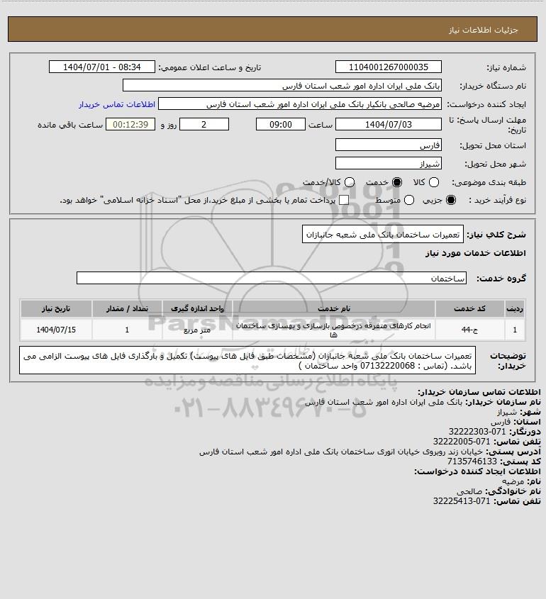 شرح کلی نیاز: تعمیرات ساختمان بانک ملی شعبه جانبازان