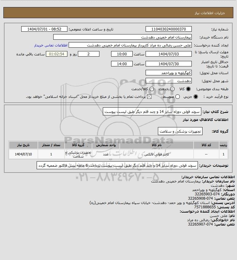 شرح کلی نیاز: سوند فولی دوراه سایز 14 و چند قلم دیگر طبق لیست پیوست