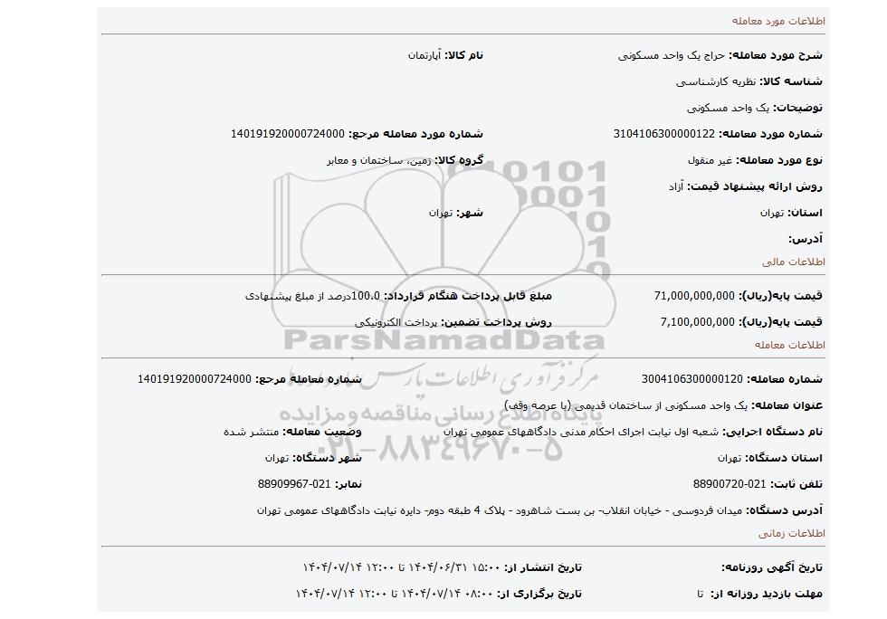 شرح مورد معامله: حراج یک واحد مسکونینام کالا: آپارتمان