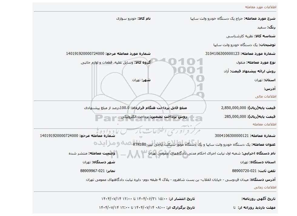 | عنوان معامله: یک دستگاه خودرو وانت سایپا و یک دستگاه موتور سیکلت آپاچی تیپ RTR180 | ||