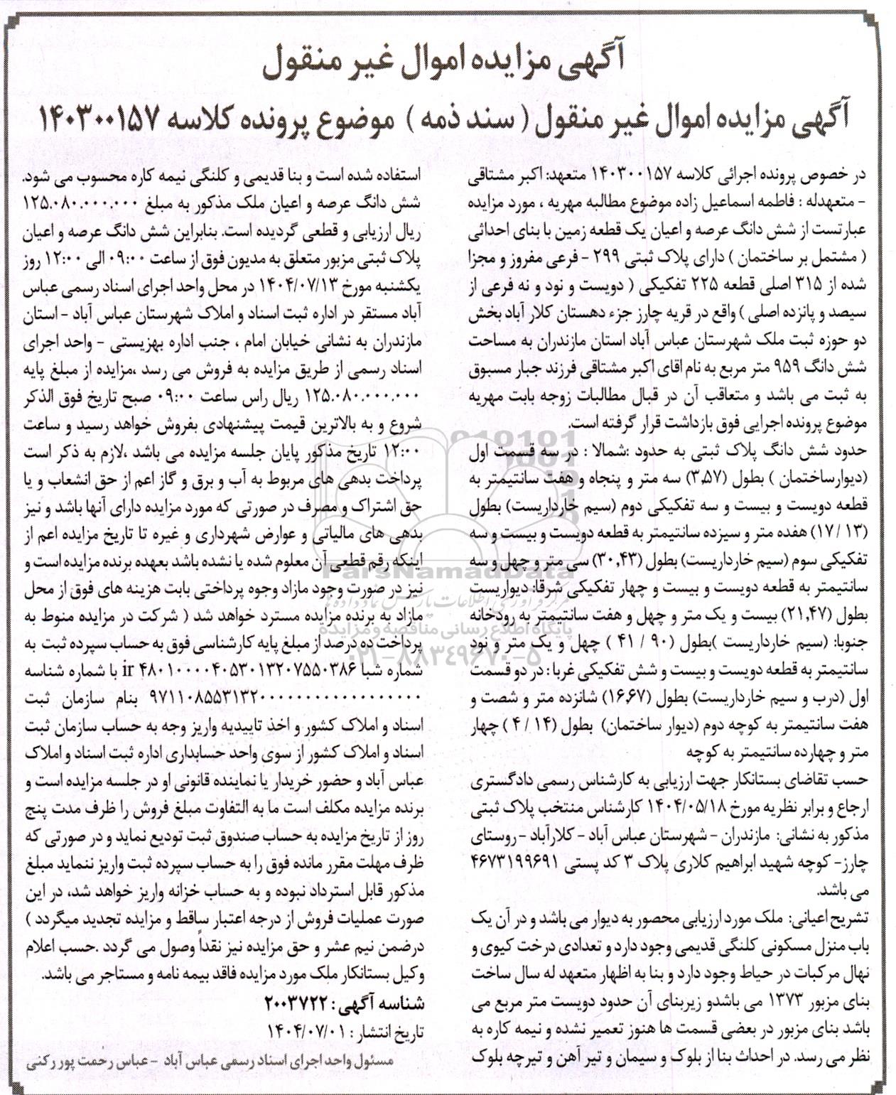 در خصوص پرونده اجرائی کلاسه 140300157 متعهد: اکبر مشتاقی متعهدله : فاطمه اسماعیل زاده موضوع مطالبه مهریه ، مورد مزایده عبارتست از شش دانگ عرصه و اعیان یک قطعه زمین با بنای احداثی مشتمل بر ساختمان ( دارای پلاک ثبتی 299 - فرعی مفروز و مجزا شده از 315 اصلی قطعه 225 تفکیکی ) دویست و نود و نه فرعی از سیصد و پانزده اصلی) واقع در قریه چارز جزء دهستان کلار آباد بخش دو حوزه ثبت ملک شهرستان عباس آباد استان مازندران به مساحت شش دانگ 959 متر مربع به نام آقای اکبر مشتاقی فرزند جبار مسبوق به ثبت می باشد و متعاقب آن در قبال مطالبات زوجه بابت مهریه موضوع پرونده اجرایی فوق بازداشت قرار گرفته است.