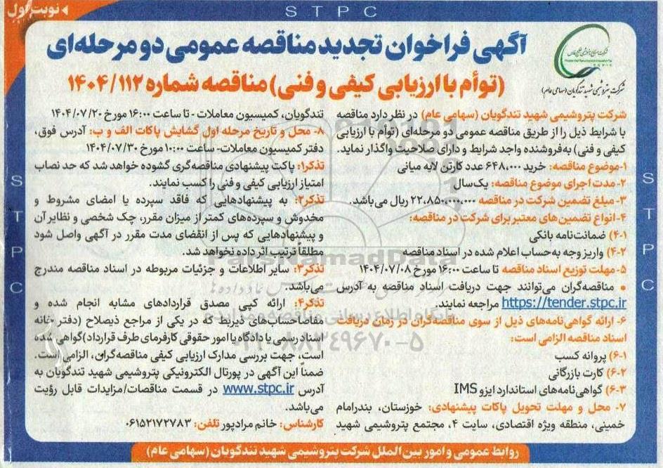 شرکت پتروشیمی شهید تندگویان (سهامی عام) در نظر دارد مناقصه با شرایط ذیل را از طریق مناقصه عمومی دو مرحله ای توأم با ارزیابی کیفی و فنی به فروشنده واجد شرایط و دارای صلاحیت واگذار نماید.