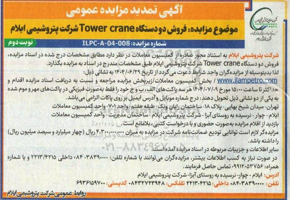 شرکت پتروشیمی ایلام به استناد مجوز صادره از کمیسیون معاملات،در نظر دارد  مطابق مشخصات درج شده در اسناد مزایده، فروش دو دستگاه Tower crane شرکت پتروشیمی ایلام طبق مشخصات مندرج در اسناد به مزایده بگذارد. لذا بدینوسیله از مزایده گران واجد شرایط دعوت می گردد از تاریخ 1404.06.29 به  نشانی ذیل :