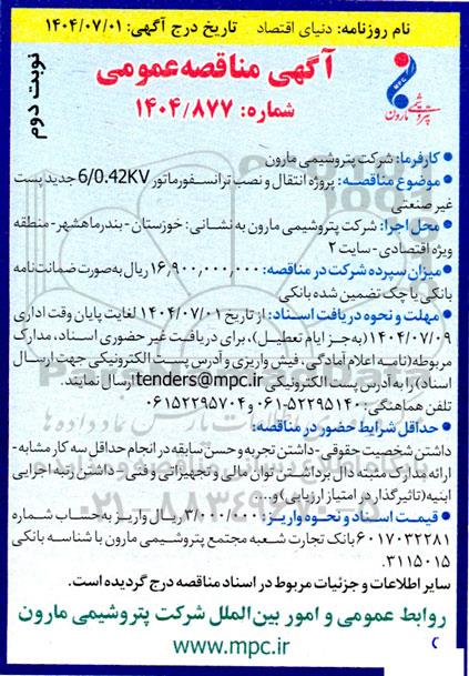 مناقصه پروژه انتقال و نصب ترانسفورماتور 6.0.42KV جدید پست غیر صنعتی نوبت دوم از کلیه افراد متخصص و شرکتها واجد شرایط دعوت به عمل میآید در مناقصه با کد خبرگزاری پارس نماد: 9587874 شرکت نمایند.