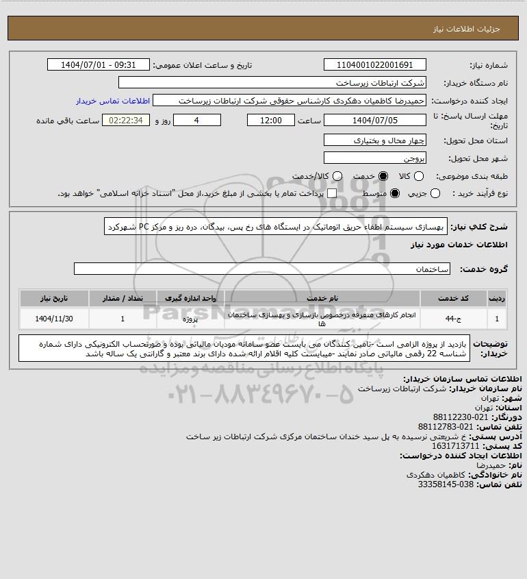 شرح کلی نیاز: بهسازی سیستم اطفاء حریق اتوماتیک در ایستگاه های رخ پس، بیدگان، دره ریز و مرکز PC شهرکرد