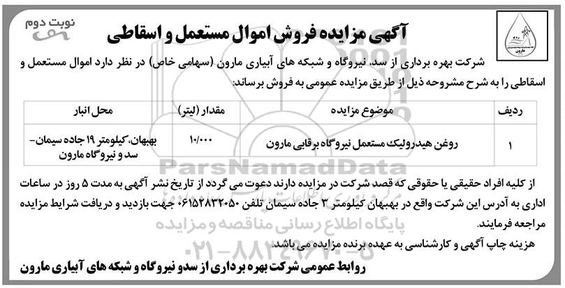 شرکت بهره برداری از سد، نیروگاه و شبکه های آبیاری مارون (سهامی خاص) در نظر دارد اموال مستعمل و اسقاطی را به شرح مشروحه ذیل از طریق مزایده عمومی به فروش برساند: