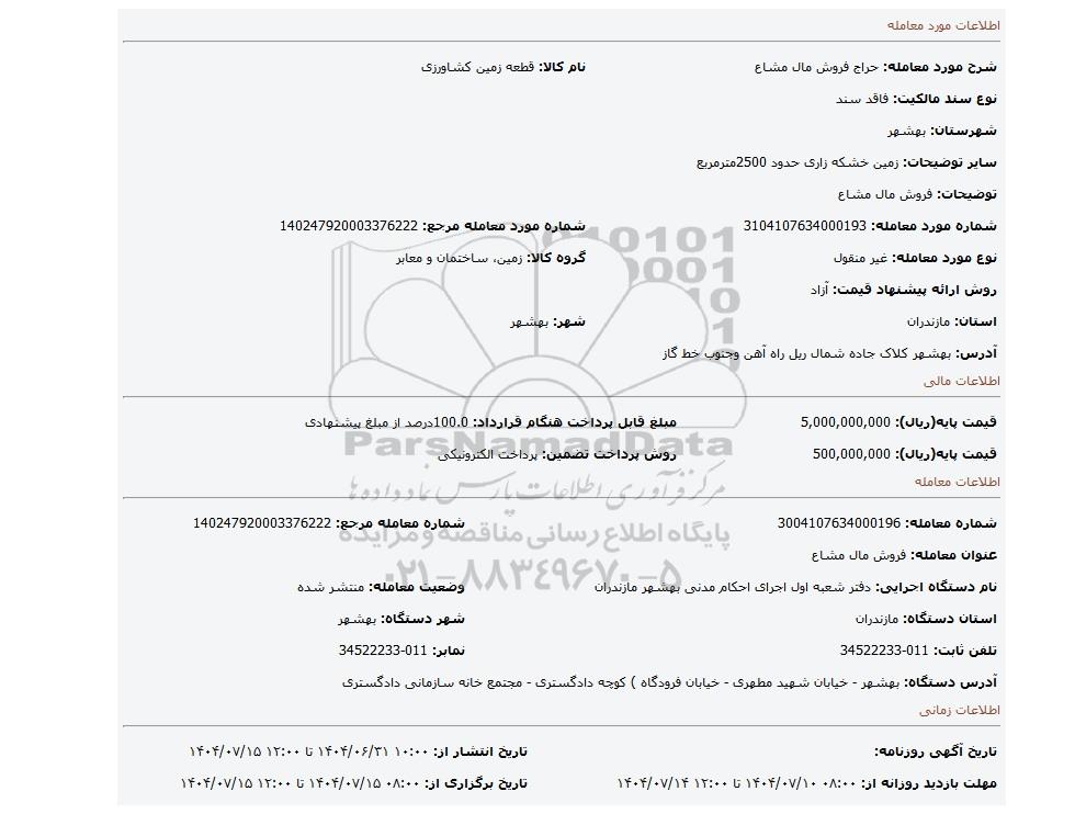 شرح مورد معامله: حراج فروش مال مشاعنام کالا: قطعه زمین کشاورزی