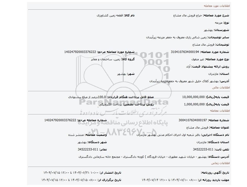 | شرح مورد معامله: حراج فروش مال مشاع | نام کالا: قطعه زمین کشاورزی | |