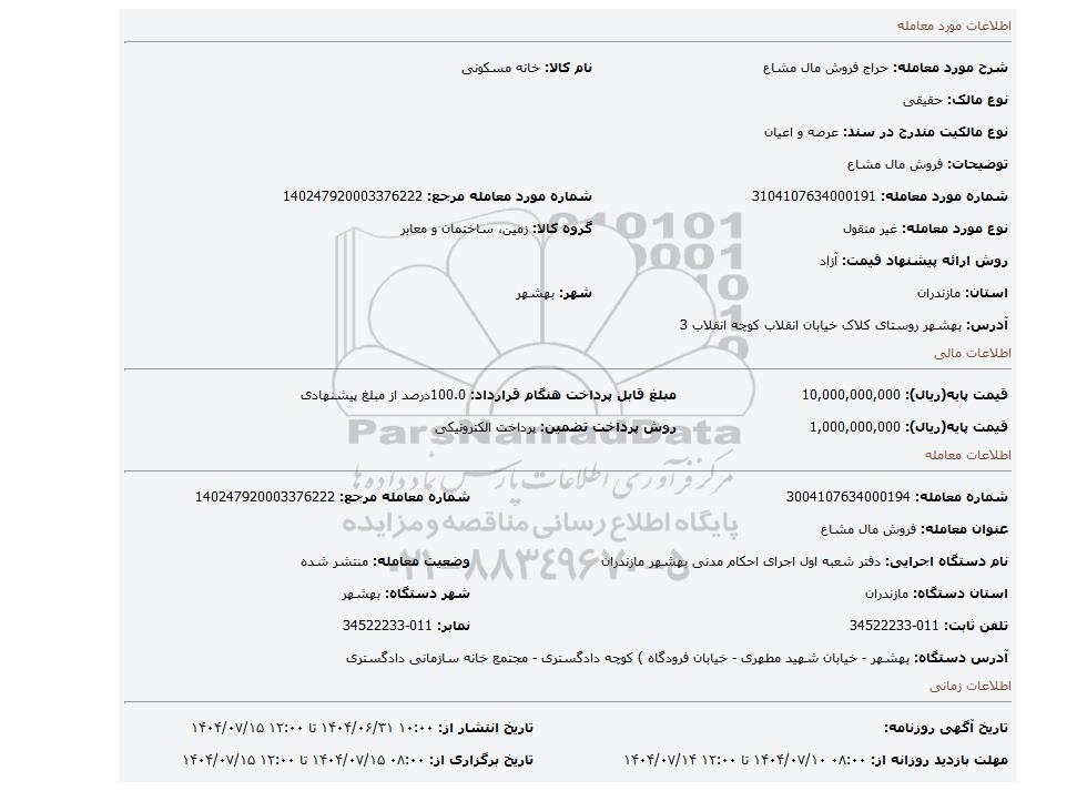مزایده عمومی مزایده فروش مال مشاع برگزار میگردد. از کلیه افراد متخصص و شرکت‌های واجد شرایط دعوت به عمل می‌آید تا در این مزایده با کد خبرگزاری پارس نماد : 9588093 شرکت نمایند تاریخ شروع مزایده : 1404/06/31 مهلت شرکت در مزایده: تا پایان روز 1404/07/15 مکان برگزاری اموال واگذاری استان‌های مازندران و دسته‌بندی‌های مربوط به این حراجی املاک و زمین میباشد. اطلاعات دقیق‌تر درباره شرایط شرکت در مزایده آنلاین و نحوه ارسال مدارک، الزامات پروژه و دریافت اسناد مزایده و تاریخ بازگشایی پاکت‌ها، در بخش اطلاعات تکمیلی این آگهی درج شده است.
