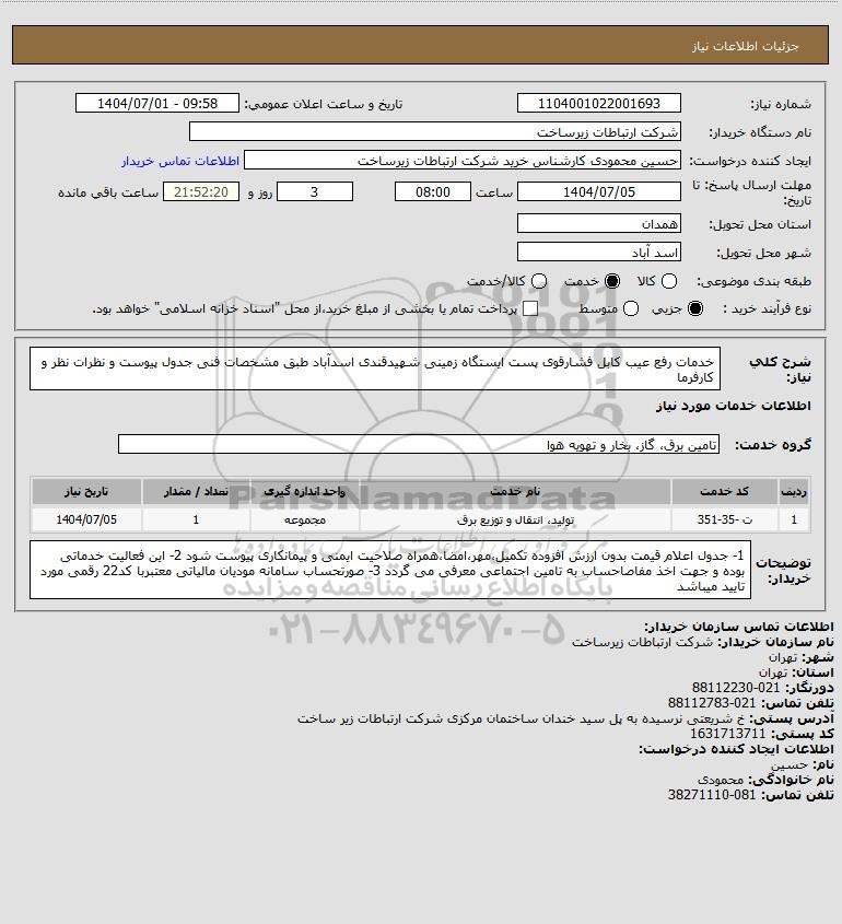 شرح کلی نیاز: خدمات رفع عیب کابل فشارقوی پست ایستگاه زمینی شهیدقندی اسدآباد طبق مشخصات فنی جدول پیوست و نظرات نظر و کارفرما