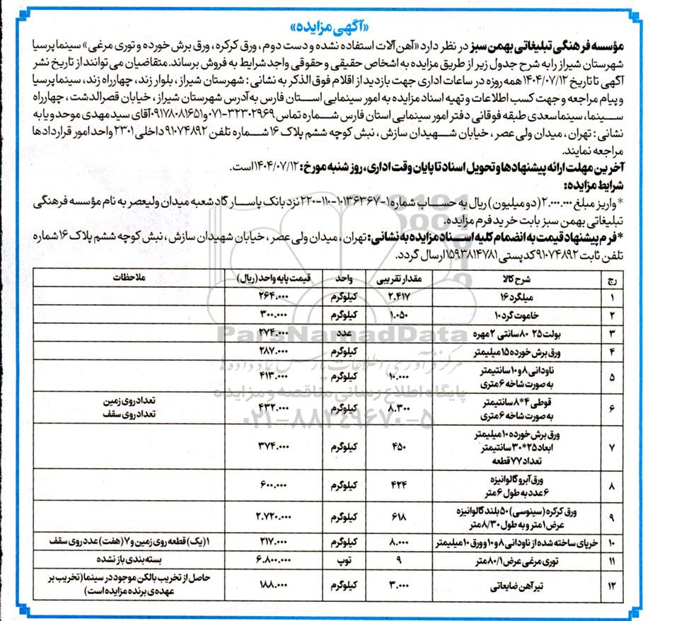 مؤسسه فرهنگی تبلیغاتی بهمن سبز در نظر دارد آهن آلات استفاده نشده و دست دوم، ورق کرکره ، ورق برش خورده و توری مرغی سینما پرسیا شهرستان شیراز را به شرح جدول زیر از طریق مزایده به اشخاص حقیقی و حقوقی واجد شرایط به فروش برساند. متقاضیان می توانند از تاریخ نشر آگهی تا تاریخ 1404.07.12 همه روزه در ساعات اداری جهت بازدید از اقلام فوق الذکر به نشانی شهرستان شیراز، بلوار زند، چهارراه زند، سینما پرسیا و پیام مراجعه و جهت کسب اطلاعات و تهیه اسناد مزایده به امور سینمایی استان فارس به آدرس شهرستان شیراز، خیابان قصرالدشت، چهارراه سینما، سینما سعدی طبقه فوقانی دفتر امور سینمایی استان فارس شماره تماس 32302969-071 و 09178081651 آقای سید مهدی موحد و یا به نشانی : تهران، میدان ولی عصر، خیابان شهیدان سازش، نبش کوچه ششم، پلاک 16 ، شماره تلفن 91074892 داخلی 2301 واحد امور قراردادها مراجعه نمایند.