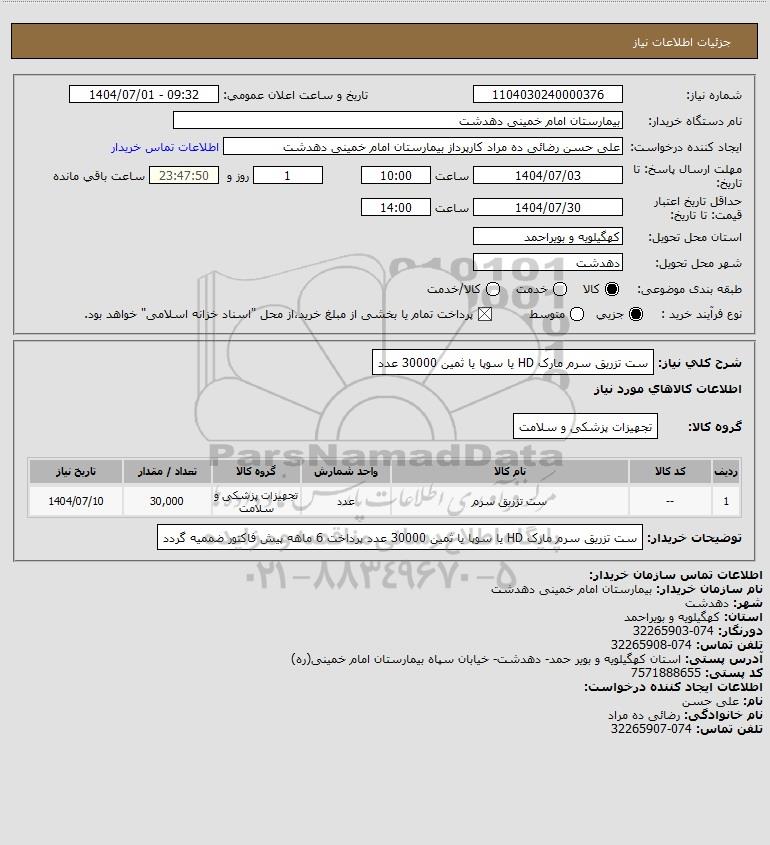 شرح کلی نیاز: ست تزریق سرم مارک HD یا سوپا یا ثمین 30000 عدد