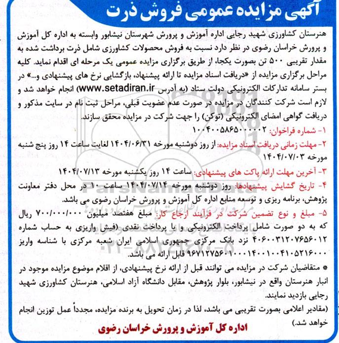 هنرستان کشاورزی شهید رجایی اداره آموزش و پرورش شهرستان نیشابور وابسته به اداره کل آموزش و پرورش خراسان رضوی در نظر دارد نسبت به فروش محصولات کشاورزی شامل ذرت برداشت شده به مقدار تقریبی 500 تن بصورت یکجا از طریق برگزاری مزایده عمومی یک مرحله ای اقدام نماید. کلیه مراحل برگزاری مزایده از دریافت اسناد مزایده تا ارائه پیشنهاد بازگشایی نرخهای پیشنهادی و.... در بستر سامانه تدارکات الکترونیکی دولت ستاد به آدرس سایت ستاد ایران انجام خواهد شد و لازم است شرکت کنندگان در مزایده در صورت عدم عضویت قبلی مراحل ثبت نام در سایت مذکور و دریافت گواهی امضای الکترونیکی (توکن )را جهت شرکت در مزایده محقق سازند.