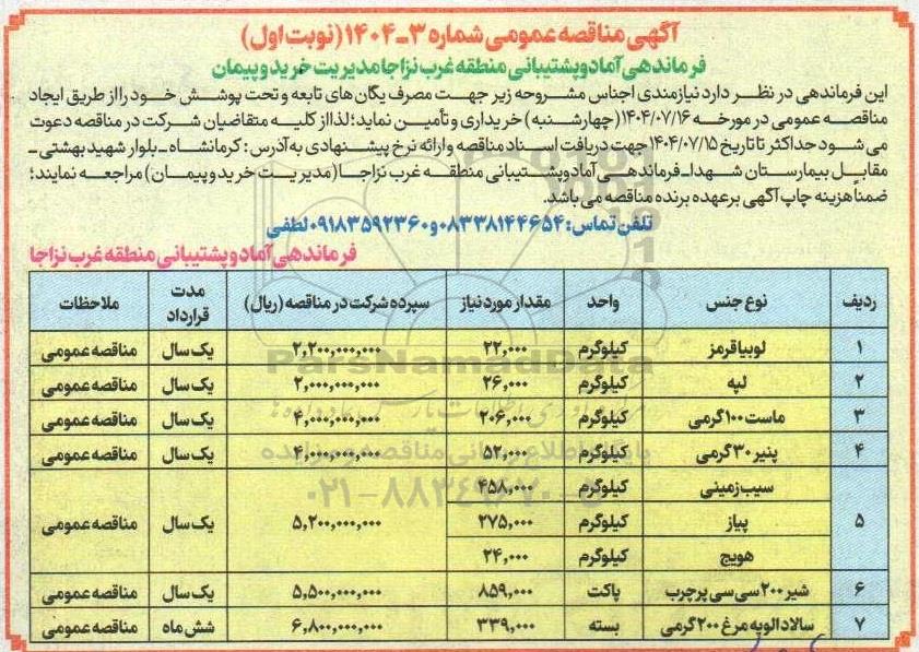 این فرماندهی درنظر دارد نیازمندی اجناس مشروحه زیر جهت مصرف یگان های تابعه و تحت پوشش خود را از طریق ایجاد مناقصه عمومی در مورخ 1404.7.16 چهارشنبه خریداری و تامین نماید. لذا از کلیه متقاضیان شرکت در مناقصه دعوت می شود حداکثر تا تاریخ 1404.7.15 جهت دریافت اسناد مناقصه و ارائه نرخ پیشنهادی به ادرس کرمانشاه بلوار شهید بهشتی مقابل بیمارستان شهدا فرماندهی اماد و پشتیبانی منطقه غرب نزاجا مدیریت خرید و پیمان مراجعه نمایند. ضمنا هزینه چاپ اگهی به عهده برنده مناقصه می باشد.