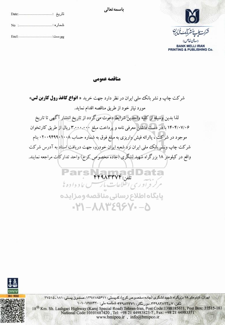 شرکت چاپ و نشر بانک ملی ایران در نظر دارد جهت خرید «انواع کاغذ رول کاربن لس» مورد نیاز خود از طریق مناقصه اقدام نماید.