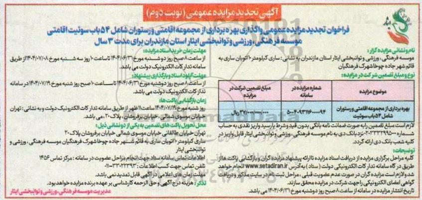 فراخوان تجدید مزایده عمومی واگذاری بهره برداری از مجموعه اقامتی و رستوران شامل 54 باب سوئیت اقامتی موسسه فرهنگی ورزشی و توانبخشی ایثار استان مازندران برای مدت 3 سال