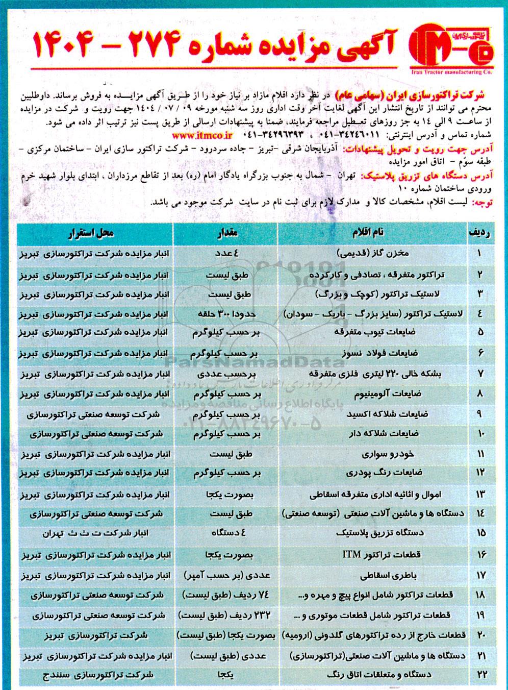 | 16 | قطعات تراکتور ITM | بصورت یکجا | انبار مزایده شرکت تراکتورسازی تبریز |
