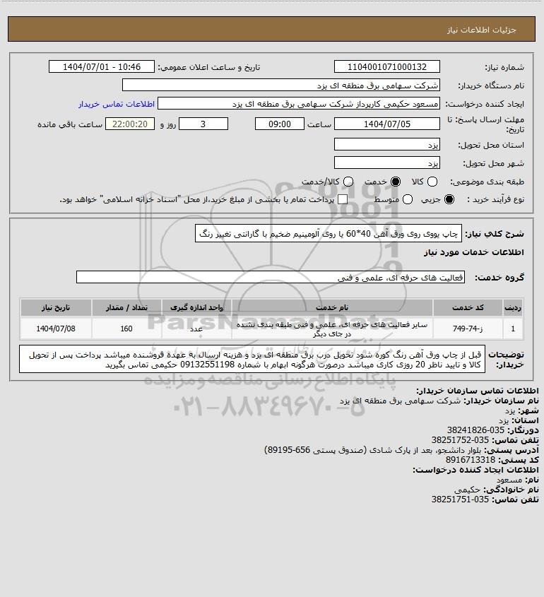 استعلام بها و موضوع استعلام استعلام چاپ یووی روی ورق آهن 40*60 یا روی آلومینیم ضخیم با گارانتی تغییر رنگ به اطلاع کلیه شرکتها و افراد متخصص واجد شرایط میرساند، آگهی گذار در نظر دارد از طریق استعلام بها، نسبت به انتخاب و دریافت پیشنهادات اقدام نماید. این استعلام با کد آگهی ثبت شده در سامانه خبرگزاری پارس نماد : 9588796 منتشر شده است. مشخصات استعلام : تاریخ شروع استعلام: 1404/07/01 آخرین مهلت ارسال پیشنهاد قیمت : 1404/07/05 و محل اجرای پروژه : استان یزد میباشد. استعلام قیمت مورد درخواست : استعلام چاپ یووی روی ورق آهن 40*60 یا روی آلومینیم ضخیم با گارانتی تغییر رنگ با دستهبندیهای تخصصی و گروه های مرتبط : طراحی چاپ و تبلیغات, صنایع ورقکاری, استعلام اطلاع رسانی میگردد. شرایط شرکت در استعلام آنلاین : ابتدا ثبت نام در سامانه استعلام پارس نماد و تکمیل مدارک موردنیاز و بارگذاری در سامانه رعایت تمامی ضوابط و الزامات مندرج در اسناد استعلام است.