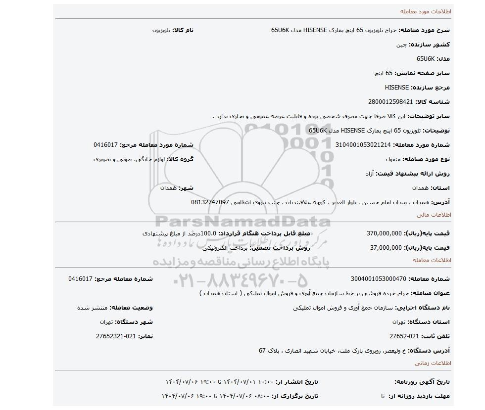 | شرح مورد معامله: حراج تلویزیون 65 اینچ بمارک HISENSE مدل 65U6K | نام کالا: تلویزیون | |