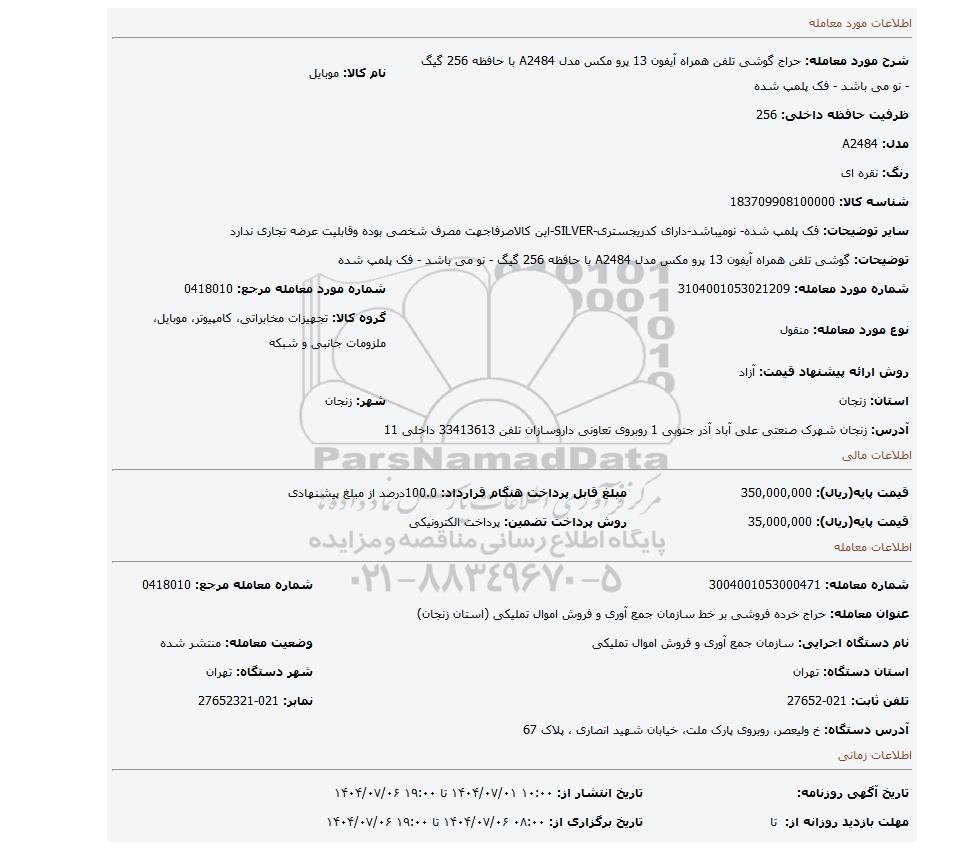 مزایده عمومی مزایده گوشی تلفن همراه آیفون 13 پرو مکس مدل A2484 با حافظه 256 گیگ - نو می باشد - فک پلمپ شده برگزار میگردد. از کلیه افراد متخصص و شرکت‌های واجد شرایط دعوت به عمل می‌آید تا در این مزایده با کد خبرگزاری پارس نماد : 9589028 شرکت نمایند تاریخ شروع مزایده : 1404/07/01 مهلت شرکت در مزایده: تا پایان روز 1404/07/06 مکان برگزاری اموال واگذاری استان‌های زنجان و دسته‌بندی‌های مربوط به این حراجی مخابرات میباشد.