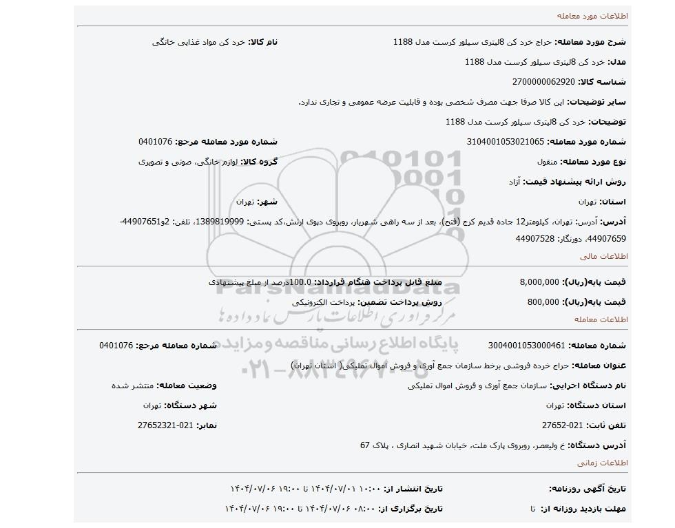| عنوان معامله: حراج خرده فروشی برخط سازمان جمع آوری و فروش اموال تملیکی( استان تهران) | ||