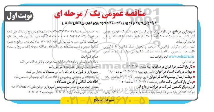 شهرداری مریانج در نظر دارد فراخوان خرید و تجهیز یکدستگاه خودروی فورس آتش نشانی به شماره 2004005105000009 را از طریق سامانه تدارکات الکترونیکی دولت برگزار نماید.