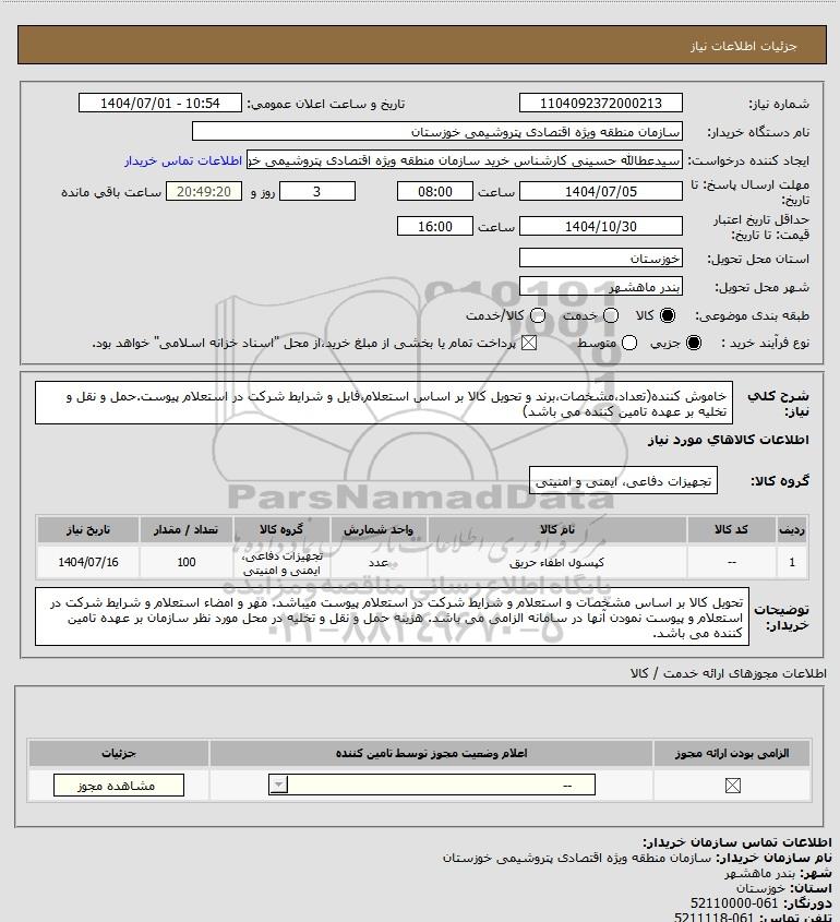 شرح کلی نیاز: خاموش کننده(تعداد،مشخصات،برند و تحویل کالا بر اساس استعلام،فایل و شرایط شرکت در استعلام پیوست.حمل و نقل و تخلیه بر عهده تامین کننده می باشد)