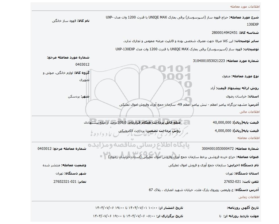 مزایده عمومی مزایده قهوه ساز (اسپرسوساز) برقی بمارک UNIQE MAX با قدرت 1200 وات مدل UXP-130EXP برگزار میگردد. از کلیه افراد متخصص و شرکت‌های واجد شرایط دعوت به عمل می‌آید تا در این مزایده با کد خبرگزاری پارس نماد : 9589187 شرکت نمایند تاریخ شروع مزایده : 1404/07/01 مهلت شرکت در مزایده: تا پایان روز 1404/07/06 مکان برگزاری اموال واگذاری استان‌های خراسان رضوی و دسته‌بندی‌های مربوط به این حراجی متفرقه میباشد.