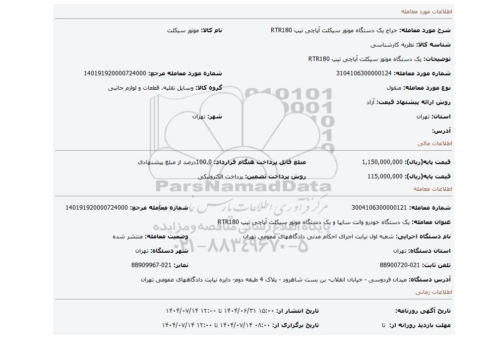 | نام دستگاه اجرایی: شعبه اول نیابت اجرای احکام مدنی دادگاههای عمومی تهران | وضعیت معامله: منتشر شده | |