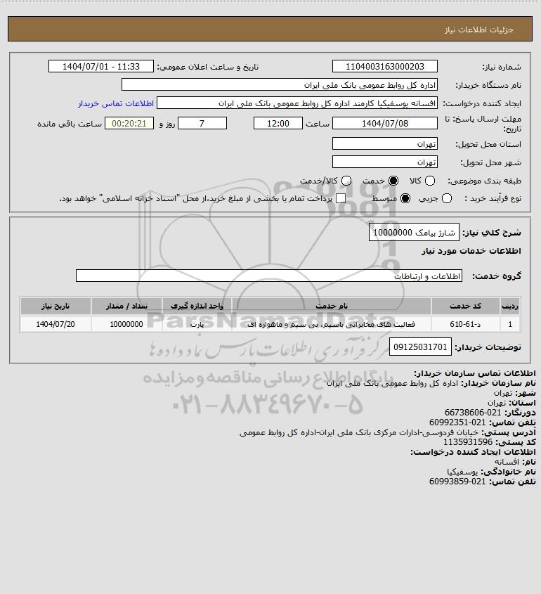 شرح کلی نیاز: شارژ پیامک 10000000