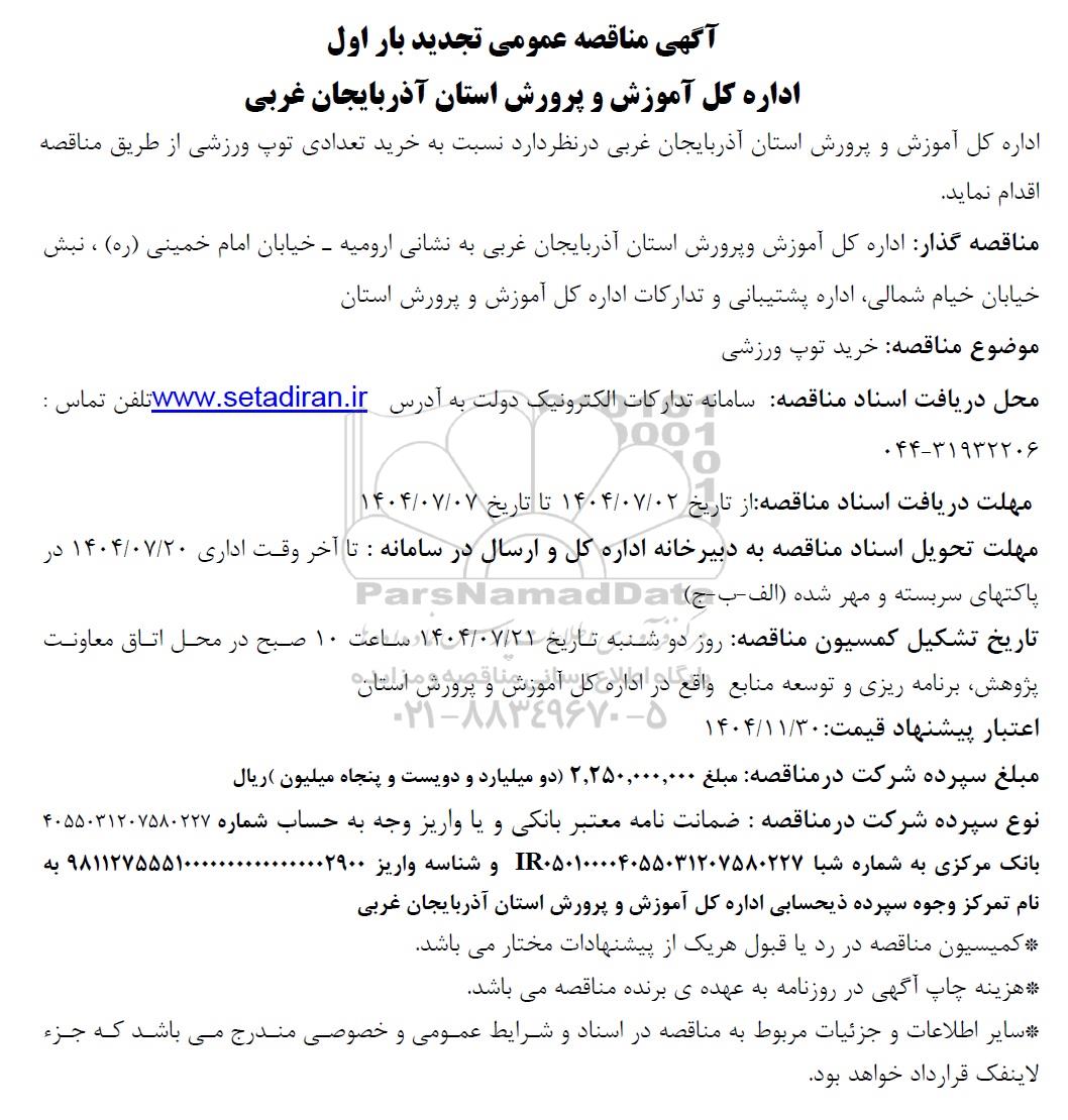اداره کل آموزش و پرورش استان آذربایجان غربی در نظر دارد نسبت به خرید تعدادی توپ ورزشی از طریق مناقصه اقدام نماید.