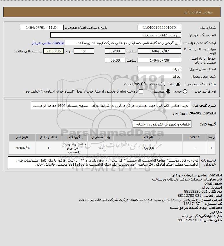شرح کلی نیاز: خرید اجناس الکتریکی جهت بهسازی مراکز جایگزین در شرایط بحران - تسویه زمستان 1404