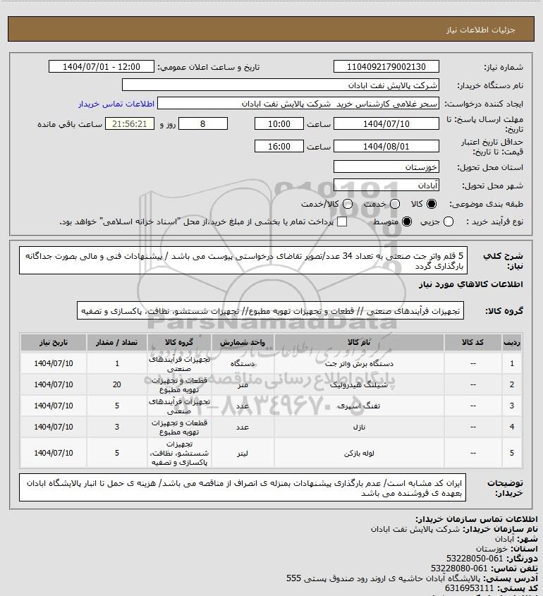 شرح کلی نیاز: 5 قلم واتر جت صنعتی به تعداد 34 عدد/تصویر تقاضای درخواستی پیوست می باشد / پیشنهادات فنی و مالی بصورت جداگانه بارگذاری گردد