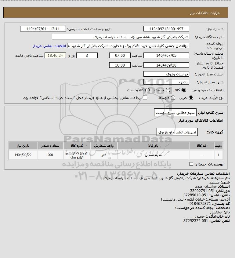 شرح کلی نیاز: سیم مطابق شرح پیوست