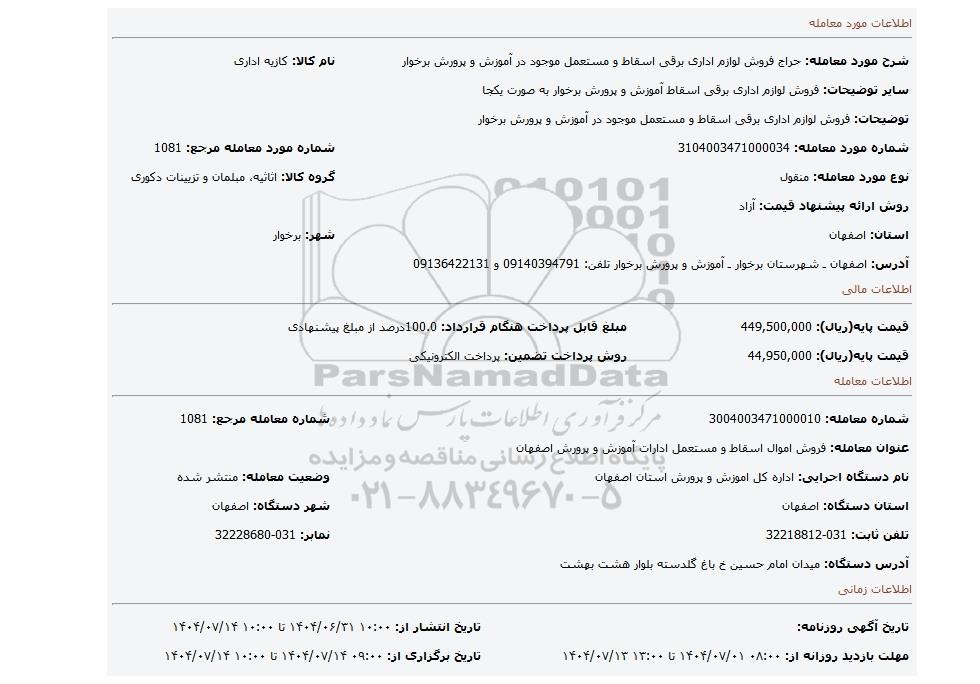 | سایر توضیحات: فروش لوازم اداری برقی اسقاط آموزش و پرورش برخوار به صورت یکجا | ||