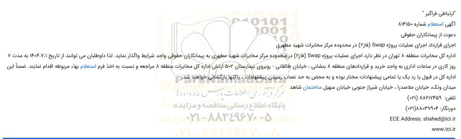 اداره کل مخابرات منطقه 8 تهران در نظر دارد اجرای عملیات پروژه Swap (فاز2) در محدوده مرکز مخابرات شهید مطهری به پیمانکاران حقوقی واجد شرایط واگذار نماید. لذا داوطلبان می توانند از تاریخ 1404.7.1 به مدت 7 روز کاری در ساعات اداری به واحد خرید و قراردادهای منطقه 8 بنشانی : خیابان طالقانی - روبروی بیمارستان 502 ارتش اداره کل مخابرات منطقه 8 مراجعه و نسبت به اخذ فرم استعلام بهاء مربوطه اقدام نمایند. ضمناً این اداره کل در قبول یا رد یک یا تمامی پیشنهادات مختار بوده و به محض به حد نصاب رسیدن پیشنهادات ، پاکتها بازگشائی خواهند شد.