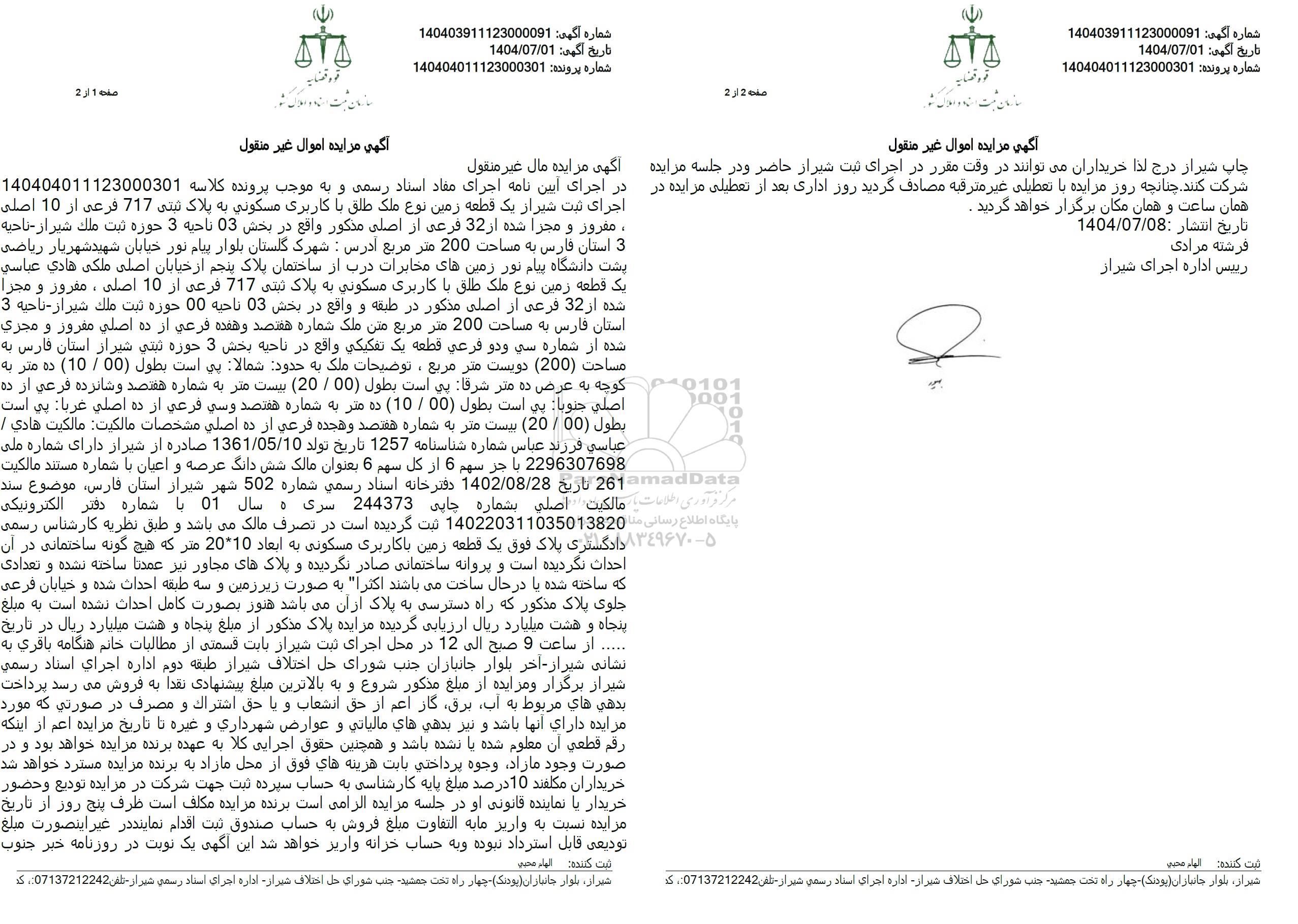 چاپ شیراز درج لذا خریداران میتوانند در وقت مقرر در اجرای ثبت شیراز حاضر و در جلسه مزایده : شرکت کنند. چنانچه روز مزایده با تعطیلی غیر مترقبه مصادف گردید روز اداری بعد از تعطیلی مزایده در همان ساعت و همان مکان برگزار خواهد گردید .