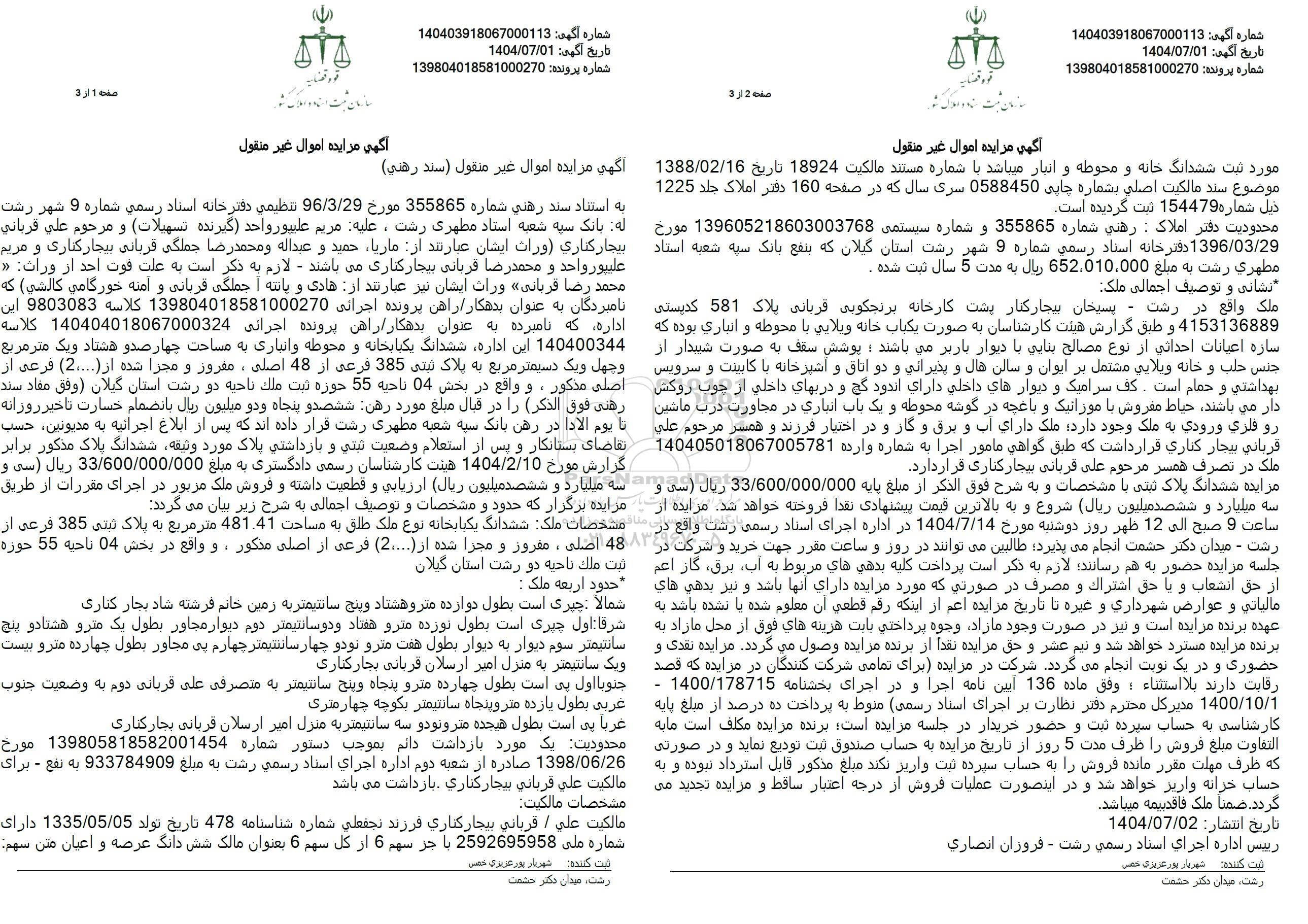 به استناد سند رهني شماره 355865 مورخ 96.3.29 تنظيمي دفترخانه اسناد رسمی شماره 9 شهر رشت له بانک سپه شعبه استاد مطهری رشت، علیه مریم علیپور واحد گیرنده تسهیلات و مرحوم علي قرباني بیجار کناری وراث ایشان عبارتند از: ماریا حمید و عبداله و محمدرضا جملگی قربانی بیجار کناری و مریم و مریم علیپور واحد و محمدرضا قربانی بیجار کناری میباشند - لازم به ذکر است به علت فوت احد از ورات « محمد رضا قربانی وراث ایشان نیز عبارتند از هادی و پانته | جملگی قربانی و امنه خورگامی کالشی که نامبردگان به عنوان بدهکار . راهن پرونده اجرائی 139804018581000270 کلاسه 9803083 این اداره که نامبرده به عنوان بدهکار . راهن پرونده اجرائی 140404018067000324 كلاسه 140400344 این اداره ششدانگ یکبابخانه و محوطه و انباری به مساحت چهار صدو هشتاد و یک متر مربع و جهل و یک دسیمتر مربع به پلاک ثبتی 385 فرعی از 48 اصلی، مفروز و مجزا شده از (....2) فرعی از اصلی مذکور، و واقع در بخش 04 ناحيه 55 حوره ثبت ملک ناحیه دو رشت استان گیلان وفق مفاد سند رهنی فوق الذکر را در قبال مبلغ مورد رهن ششصد و پنجاه و دو میلیون ریال بانضمام خسارت تاخیر روزانه تا یوم الادا در رهن بانک سپه شعبه مطهری رشت قرار داده اند که پس از ابلاغ اجرائیه به مدیونین، حسب تقاضای بستانکار و پس از استعلام وضعیت ثبتی و بازداشتی پلاک مورد وثیقه ششدانگ پلاک مذکور برابر گزارش مورخ 1404.2.10 هیئت کارشناسان رسمی دادگستری به مبلغ 33.600.000.000 ریال سی و سه میلیارد و ششصد میلیون ریال ارزیابی و قطعیت داشته و فروش ملک مزبور در اجرای مقررات از طریق