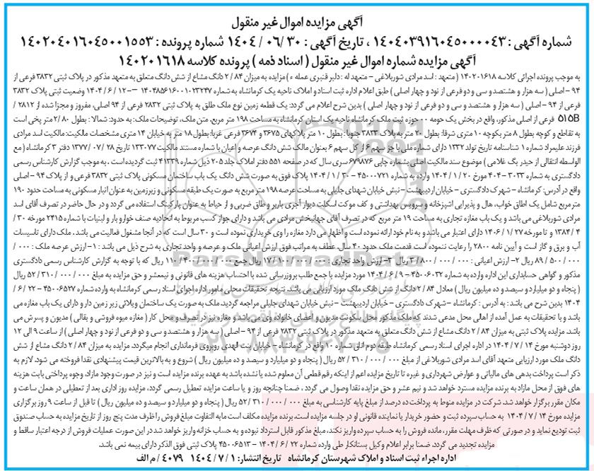مزایده به مبلغ 52.310.000.000 ریال پنجاه و دو میلیارد و سیصد و ده میلیون ریال معادل 2.84 دانگ از شش دانگ ملک مورد ارزیابی میباشد. نتیجه تحقیقات محلی مامور اداره اجرای اسناد رسمی کرمانشاه به وارده شماره 45006527- 1404.6.22 بدین شرح می باشد به آدرس : کرمانشاه - شهرک دادگستری - خیابان اردیبهشت - نبش خیابان شهدای جلیلی مراجعه گردید ملک به صورت یک
