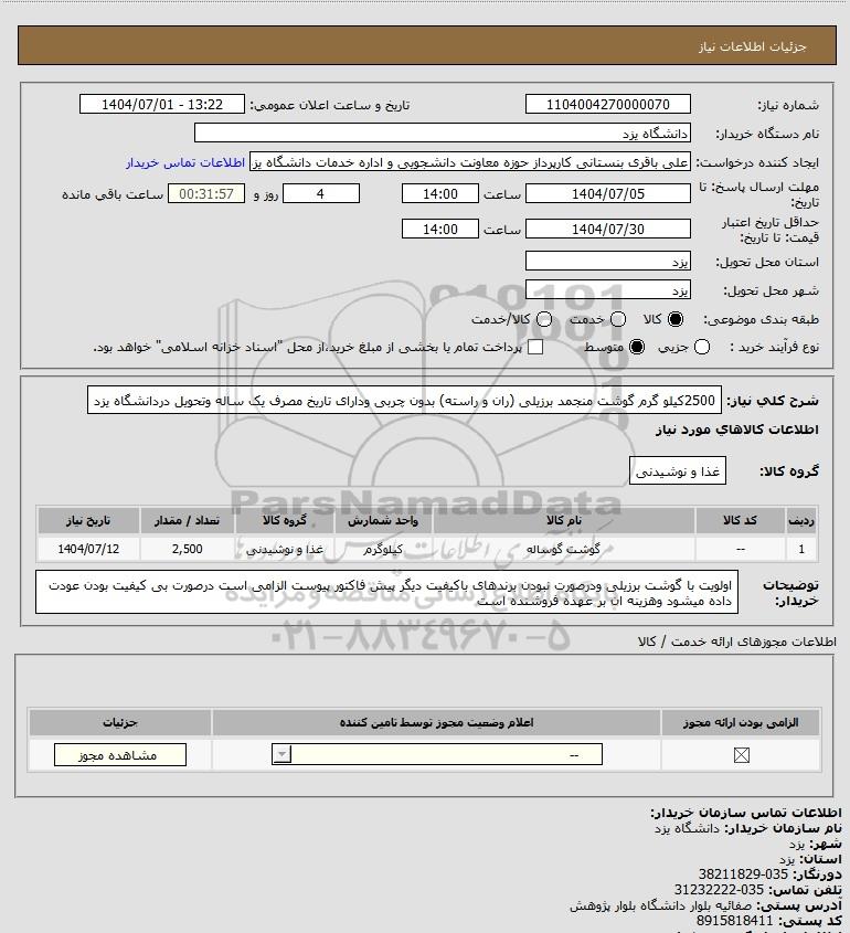 شرح کلی نیاز: 2500کیلو گرم گوشت منجمد برزیلی (ران و راسته) بدون چربی ودارای تاریخ مصرف یک ساله وتحویل دردانشگاه یزد