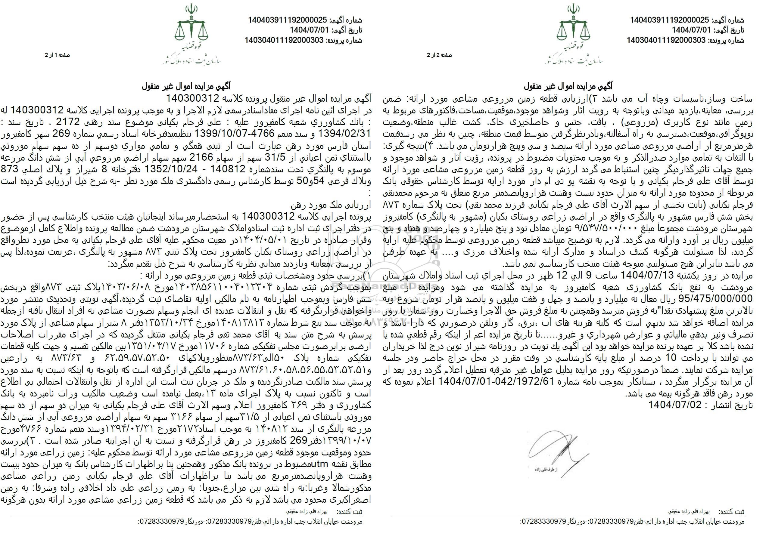 در اجرای آئین نامه اجرای مفاد اسنادرسمی لازم الاجرا و به موجب پرونده اجرایی کلاسه 140300312 له بانك كشاورزی شعبه كامفيروز عليه : علي فرجام بكياني موضوع سند رهني 2172 ، تاریخ سند : 1394.02.31 و سند متمم 4766-1399.10.07 تنظيم يدفترخانه اسناد رسمی شماره 269 شهر کامفیروز استان فارس مورد رهن عبارت است از ثبتی همگی و تمامی موازی دوسهم از ده سهم سهام مورونی با استثنای تمن اعيانی از 31.5 سهم از سهام 2166 سهم سهام اراضی مزروعی آبی از شش دانگ مزرعه موسوم به بالنگری تحت سند شماره 140812 - 1352.10.24 دفترخانه 8 شیراز و پلاک اصلی 873 وبلاك فرعي 54 و 50 توسط کارشناس رسمی دادگستری ملک مورد نظر به شرح ذیل ارزیابی گردیده است.
