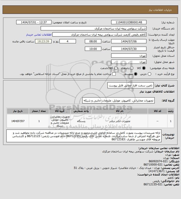 شرح کلی نیاز: تامین سخت افزار مطابق فایل پیوست