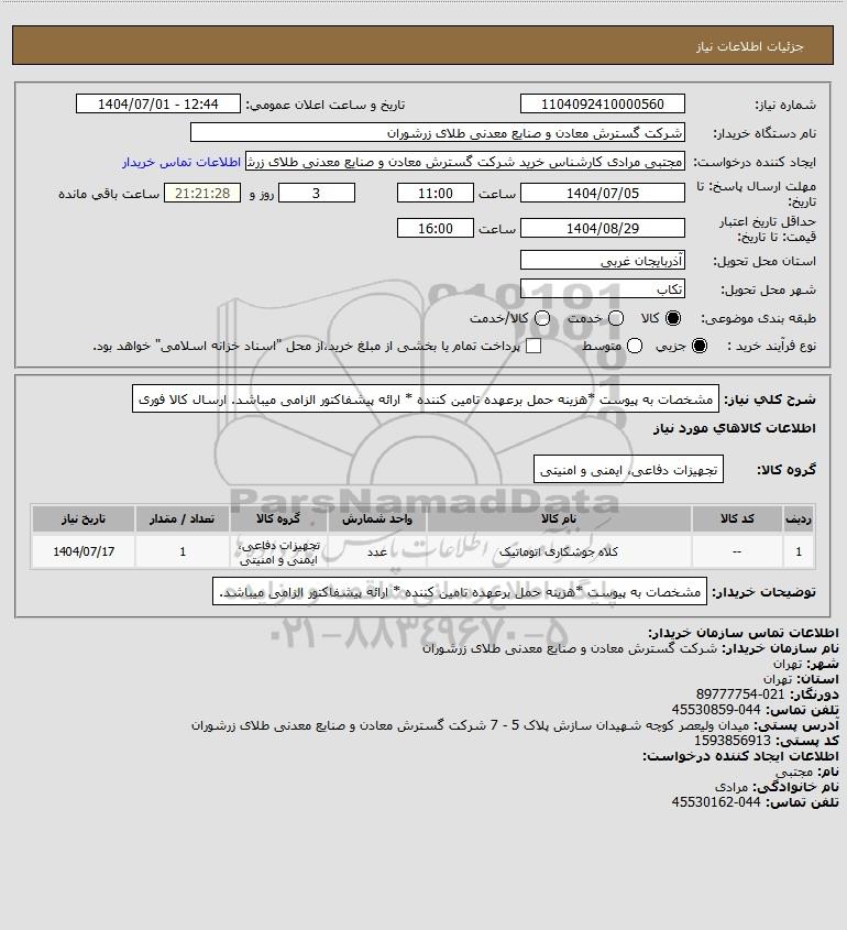 نام دستگاه خریدار:شرکت گسترش معادن و صنایع معدنی طلای زرشوران